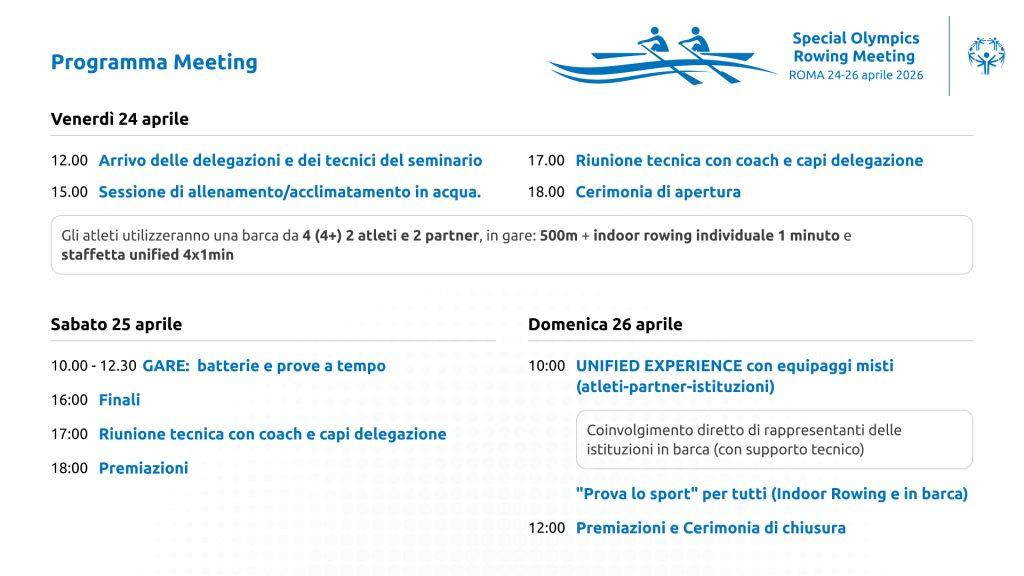 Roma, 23 aprile 2026 – Domani, 24 aprile, prende il via a Roma il Meeting Internazionale di Canottaggio Special Olympics 2026, in programma fino al 26 aprile nella suggestiva cornice del Reale Circolo Canottieri Tevere Remo.